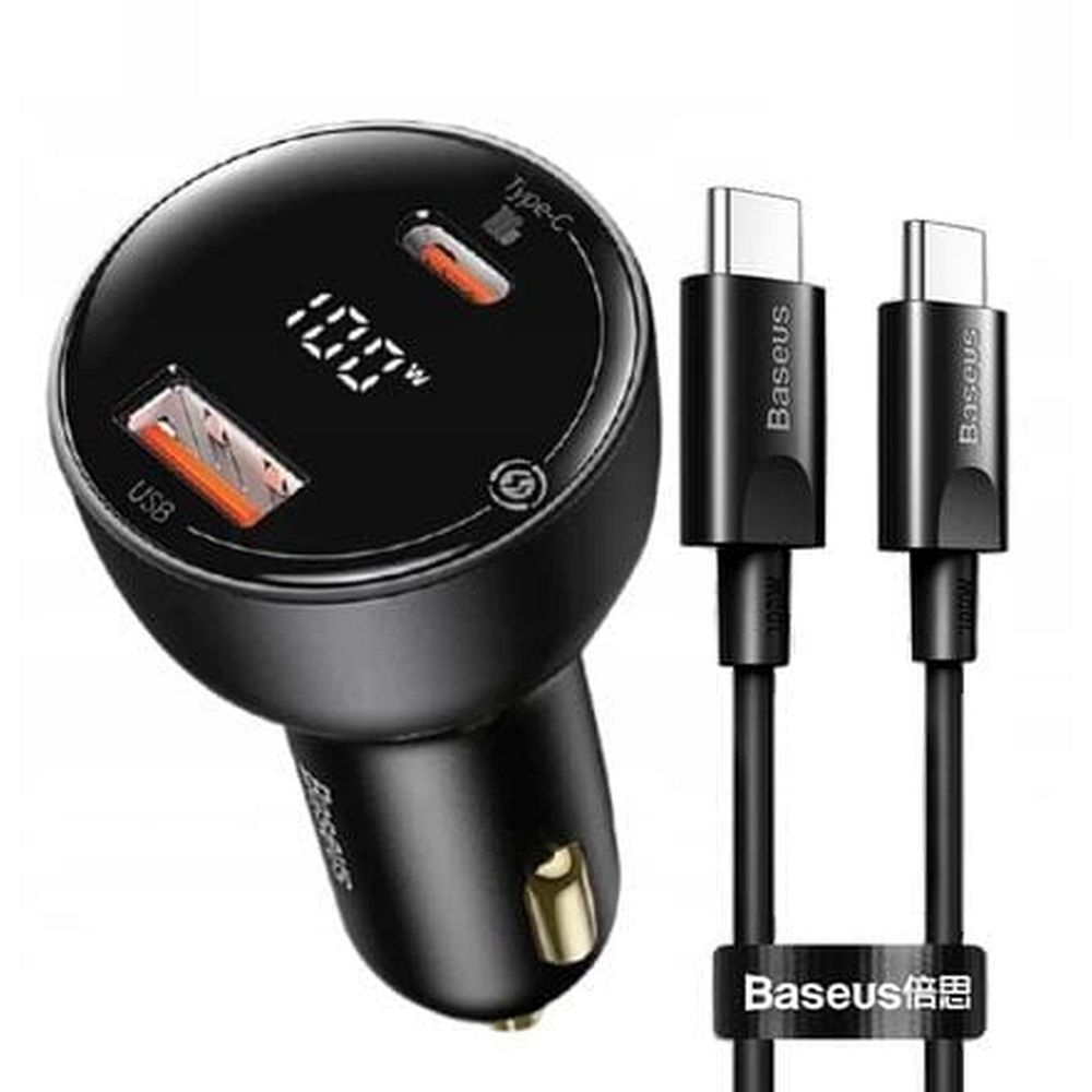 شاحن للسياره من شركه BASEUS مع منفذ TYPE-C و منفذ USB-A مع كيبل TYPE-C بقوه 100W